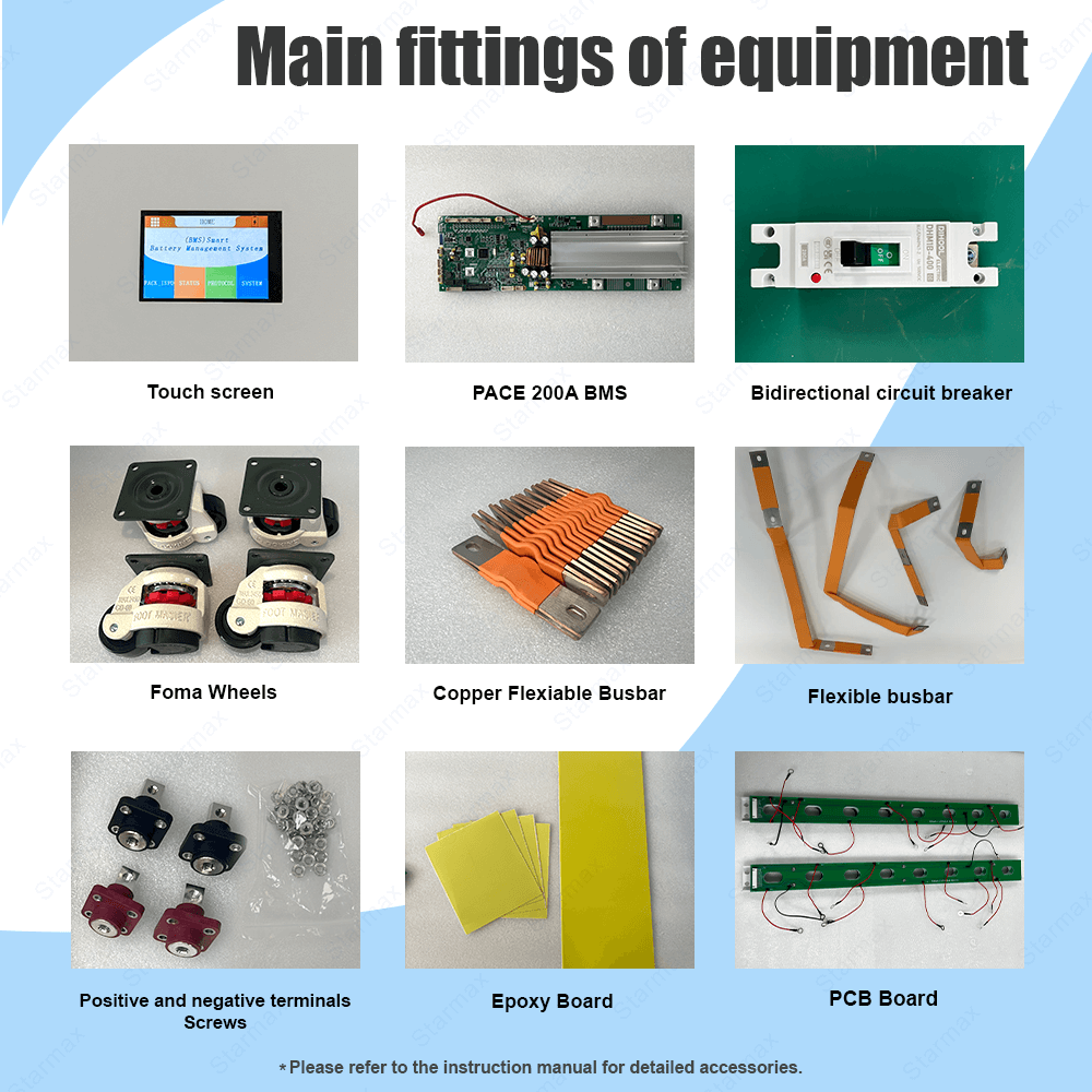 1.Metal Box;2.PCB Board;3.Smart BMS;4.Display Screen.5.EVA Foam;6.Expoxy Sheets;7.Screws;8.Copper Busbar; 9.Circuit Breaker;10.Terminals;11.Cables;12.Foma Wheel(Optional Configs) |