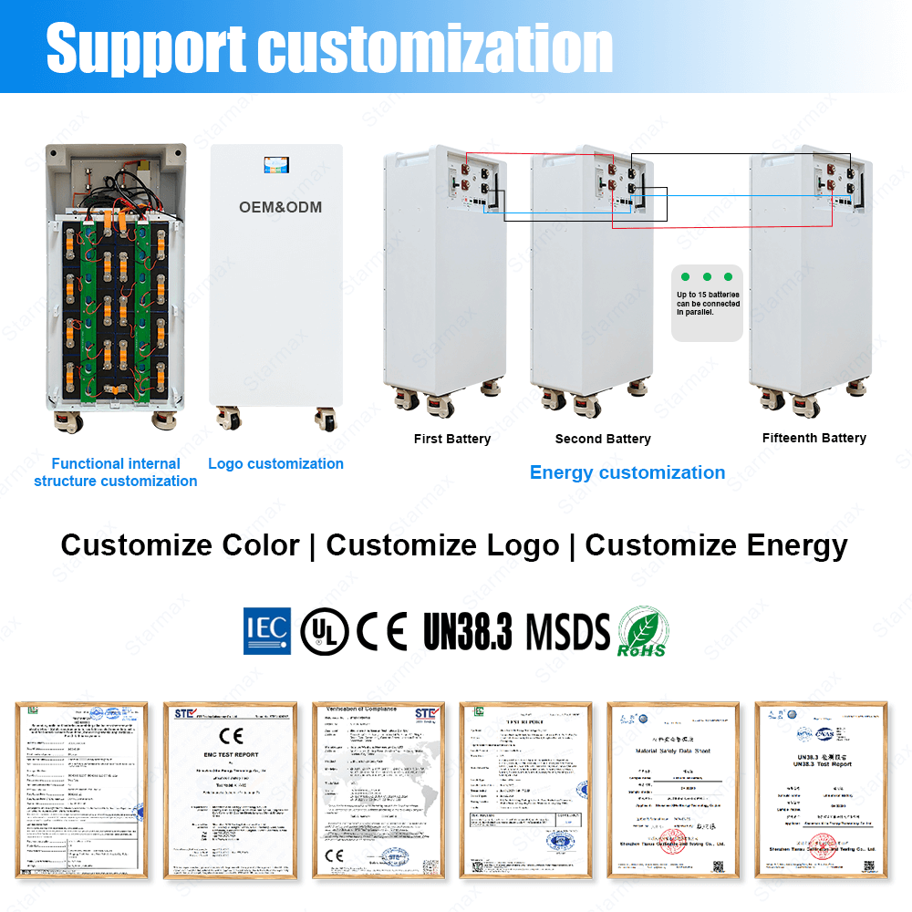 The Starmax 48V Lithium Ion Battery 314Ah Lifepo4 Battery Pack is built for expansion, supporting parallel connection of up to 16 packs to easily scale capacity from 16kWh to a massive 256kWh for large energy needs.