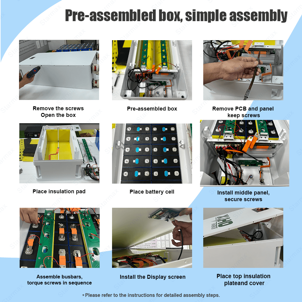 The Starmax 48V Lithium Ion Battery 314Ah Lifepo4 Battery Pack arrives as a pre-installed kit with clear terminals and switches, enabling a simple, secure, and fast setup for immediate use in your custom power system.